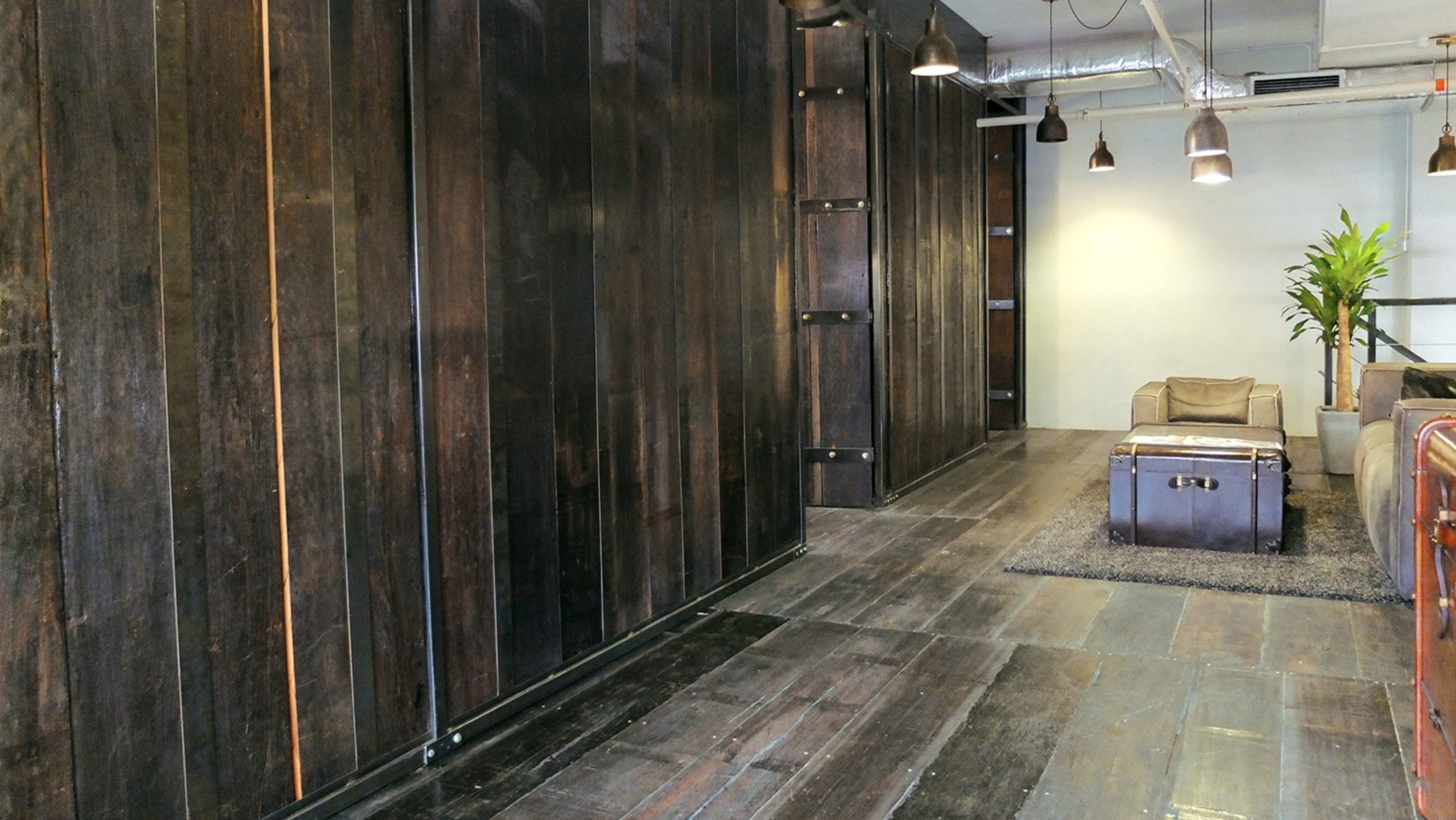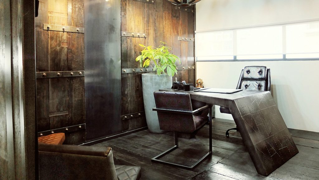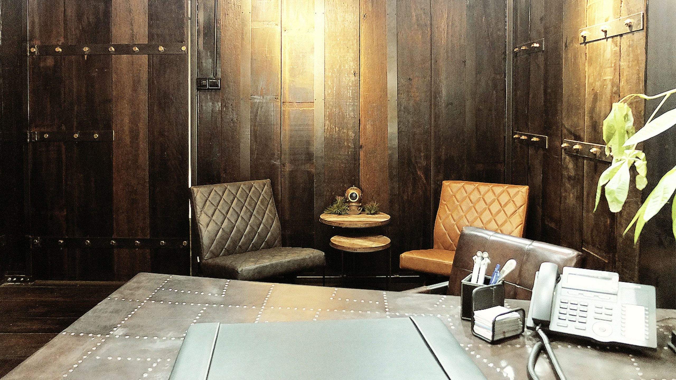 From the commanding conference room to the private executive suite, each space is thoughtfully composed to reflect a sense of quiet authority and timeless character. The design balances raw materiality with refined comfort, where solid wood tables meet sleek black steel frames, and soft lighting accentuates the depth of texture throughout.