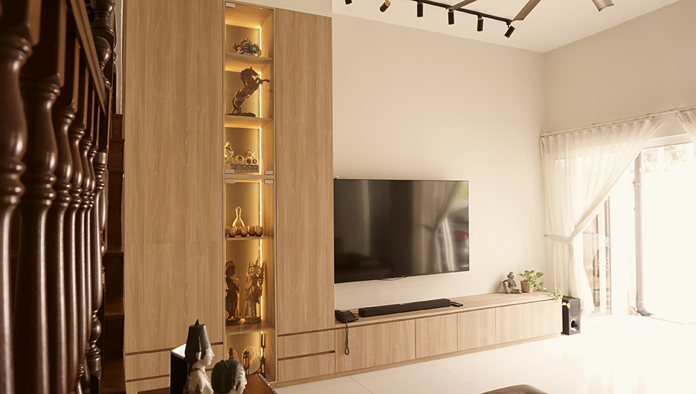 In the heart of the home, the living hall now features a full-height display cabinet with warm wood finishes and transparent glass doors — drawing the eye upward while anchoring the room with refined storage. Every detail, from the low profile TV console to the sleek vertical lines, was designed to enhance visual height without structural changes.
