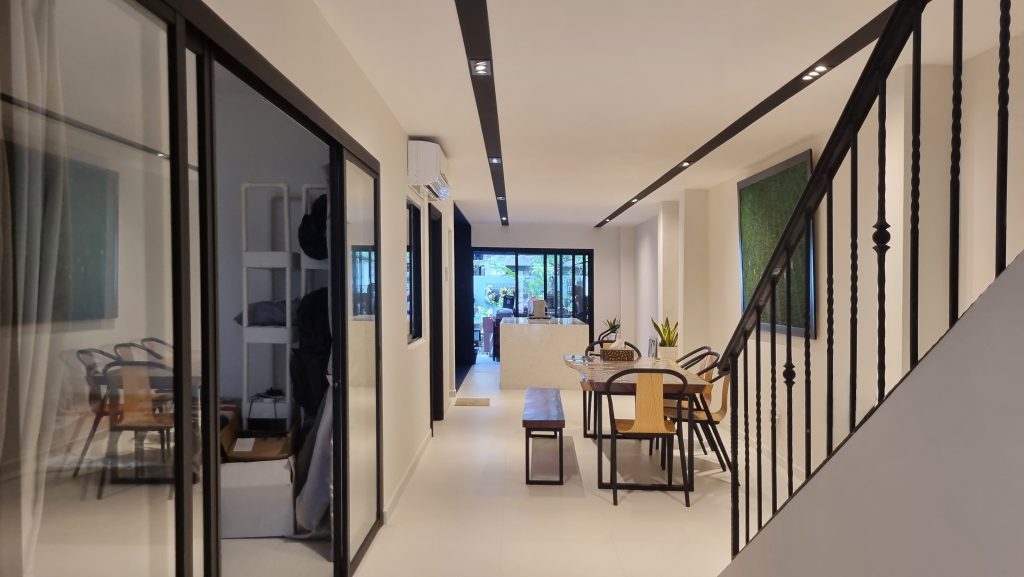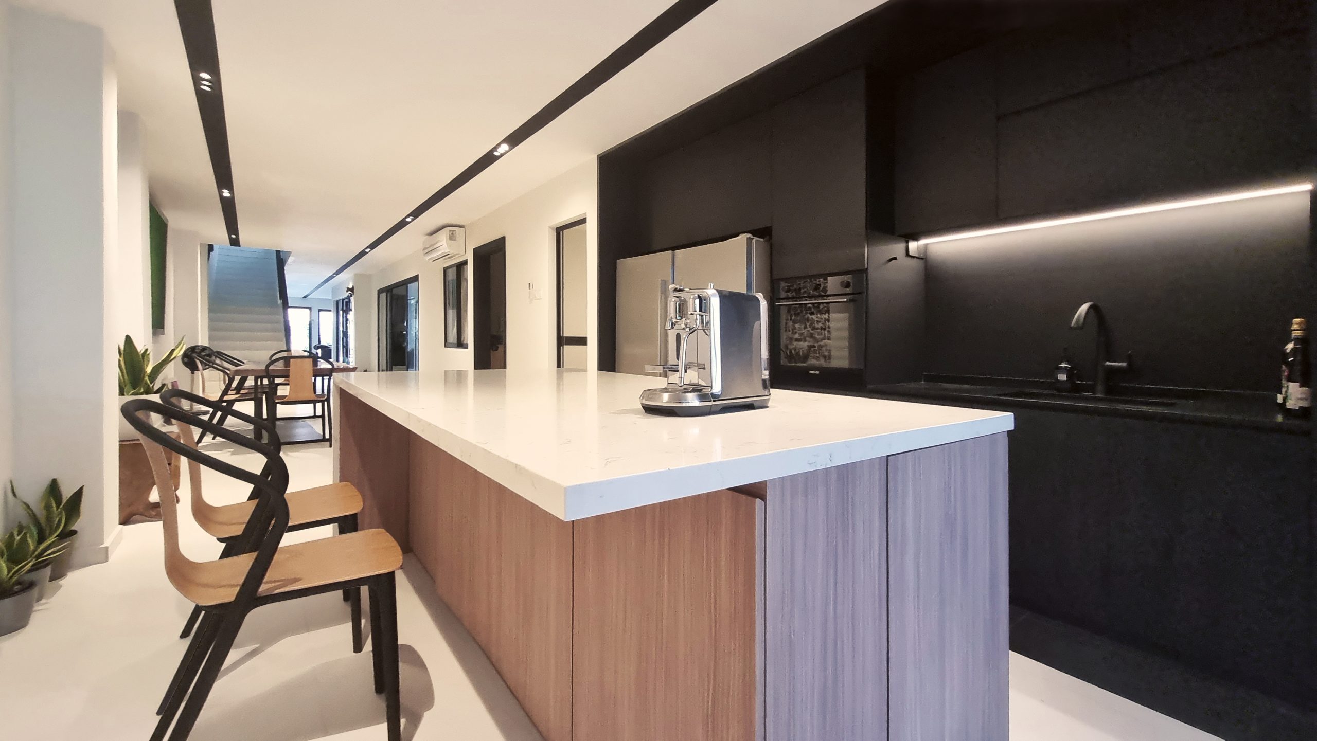 At 33 Jalan Rindu, this 6 bedroom terrace house finds its rhythm in contrast — black accents paired with soft taupes, colonial charm reimagined with modern minimalism, and functional design rooted in everyday elegance.