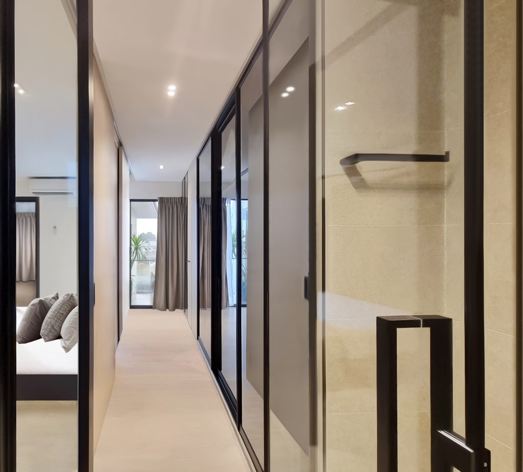 Key areas were reconfigured for better functionality: a wall was removed to expand the kitchen, turning it into a social centrepiece anchored by a sleek island. The master suite now features a walk in closet and a bathroom concealed behind custom cabinetry, balancing privacy and style.